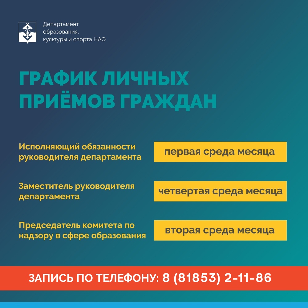В первую среду месяца личные приёмы граждан проводит исполняющий обязанности руководителя Департамента образования, культуры и спорта НАО Антон Геннадиевич Пустовалов. Во вторую среду месяца записаться на приём можно к председателю комитета по надзору в сфере образования Вокуевой Зинаиде Валентиновне. В четвертую среду месяца личные приёмы граждан осуществляет заместитель руководителя профильного Департамента - начальник управления образования Храпова Лиана Анатольевна.